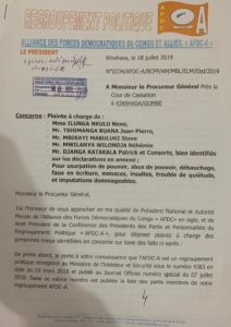 Dans cette action du 18 juillet 2019 devant le Procureur général (PG) près la Cour de cassation, contre Néné Ilunga Nkulu, Jean-Pierre Tshimanga Buana, Steve Mbikayi Mabuluki, Néhemie Mwilanya Wilondja, Patrick Djanga katakala et consorts, Modeste Bahati rappelle à ce juge qu’il est l’autorité morale et président national de l’Alliance des forces démocratiques du Congo (AFDC), et qu’il était, de droit, président de la Conférence des présidents des partis politiques et personnalités membres de ce regroupement politique.