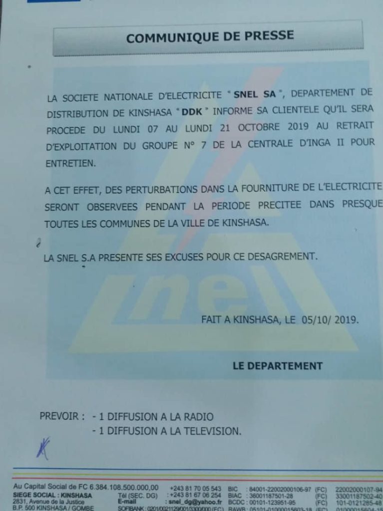 Dans un communiqué rendu public samedi 05 octobre 2019, la société nationale d’électricité (SNEL), a annoncé qu’une perturbation d’électricité sera observé dans toute la ville de Kinshasa, à partir de ce lundi 07 octobre jusqu’au 21 octobre prochain.