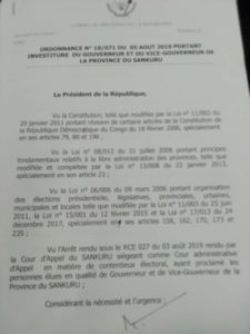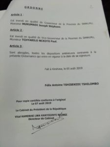 Dans son ordonnance présidentielle publiée ce mercredi 08 août 2019, le président de la République Félix Tshisekedi a investi officiellement Joseph Stéphane Mukumadi comme gouverneur du Sankuru, et Tchyabilo Nckoto Paul vice-gouverneur.