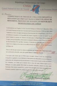 Dans un communiqué rendu public ce mardi 22 octobre, dont une copie est parvenue à la Rédaction de L’INTERVIEW.CD, Joseph Olenga Nkoy, Président du conseil national de suivi l’accord «CNSA», a appellé à la paix par rapport à la situation actuelle dans les hauts plateaux de Minembwe, au Sud-Kivu.